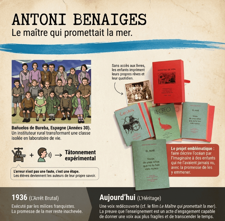 L’histoire de la pédagogie est jalonnée de figures lumineuses, mais peu sont aussi bouleversantes que celle d’Antoni Benaiges. Enseignant dans un petit village isolé de