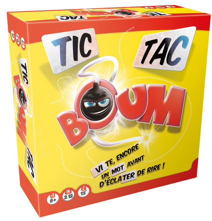 Editeur/fabriquant Asmodee / Goliath Conditionnement 1 boite cartonnée Age minimum A partir de 8 ans Nombre de joueurs De 2 à 12 joueurs Durée de la partie 15 minutes Mécanisme de jeu Association d’idées, rapidité, vocabulaire… Tic Tac Boom