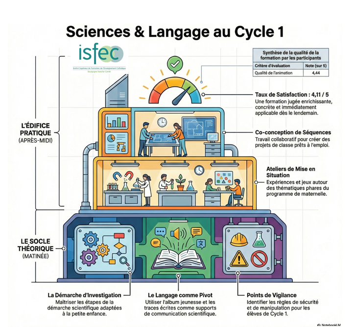 Le mercredi 25 février dernier, une salle de formation du foyer Ste Anne de Montferrand-le-Château a vibré au rythme de l’expérimentation. L’ISFEC Bourgogne Franche-Comté y organisait une journée de formation dédiée à un duo gagnant pour le cycle 1 : les sciences et le langage. Financée par Formiris, cette session a réuni des enseignants de la petite à la grande section autour d’un enjeu majeur : comment transformer l’éveil scientifique en un formidable levier d’expression orale ?