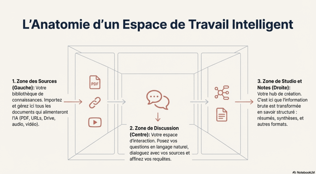 L’interface de Google NotebookLM est divisée en trois zones principales, facilitant l’organisation des informations et l’interaction avec l’IA :