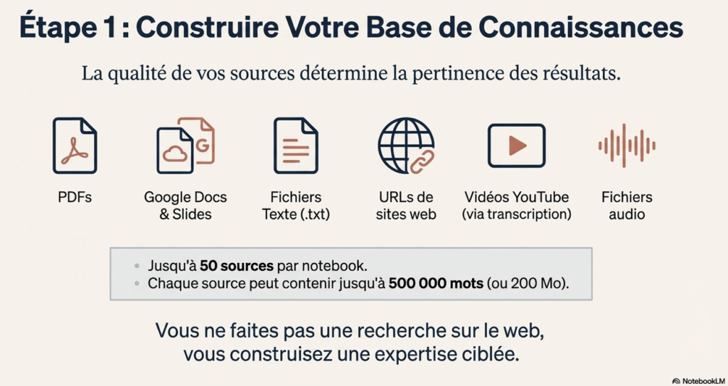- Etape 1: Sources : Importer et gérer des fichiers (PDF, texte, vidéos, pages web, audio) ou ajouter du contenu depuis Google Drive.