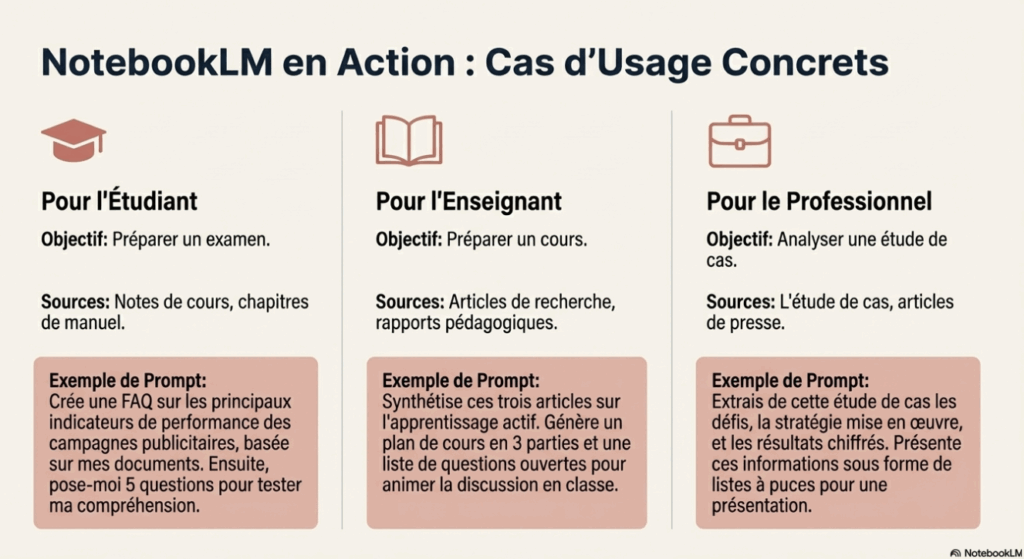 - Accessibilité accrue : Depuis septembre 2025, NotebookLM est ouvert aux élèves dès 13 ans, y compris via les comptes Workspace for Education.