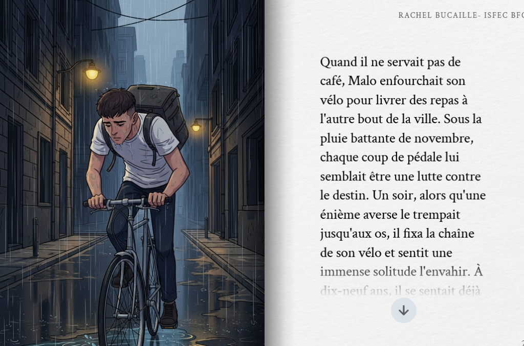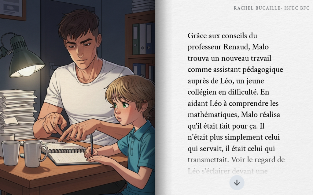 Pour éprouver l’outil, nous avons soumis à l’IA le récit de Malo, un étudiant persévérant qui, malgré les difficultés sociales et financières, parvient à décrocher son concours pour devenir enseignant. L’IA a su capturer l’émotion de ce parcours de vie, illustrant le passage du doute à la réussite. Ce test démontre la capacité de Storybook à traiter des thématiques profondes et inspirantes, tout en offrant une mise en forme professionnelle en un temps record.