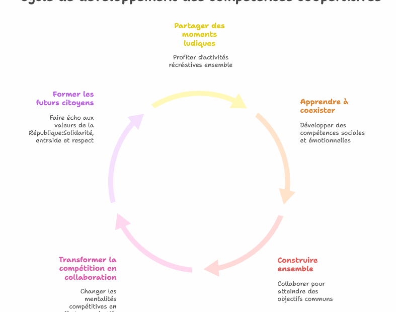 Contrairement aux jeux compétitifs qui valorisent la victoire individuelle, les jeux coopératifs placent la réussite collective au premier plan : tous les participants gagnent ou perdent ensemble. À l’école, cette approche fait écho aux valeurs de la République : solidarité, entraide et respect mutuel. Les recherches en sciences de l’éducation montrent que ces jeux contribuent directement à développer des compétences sociales et émotionnelles essentielles — communication, écoute, gestion des émotions, engagement collectif et empathie