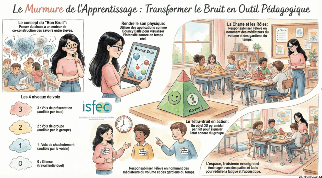 Le silence est-il toujours d’or en milieu scolaire ? Pas nécessairement. À l’ISFEC Bourgogne Franche-Comté, nous accompagnons les enseignants vers une gestion dynamique du climat de classe où le silence absolu laisse place, lors de temps spécifiques, au « bon bruit ». Ce bruit constructif est le signe d’élèves engagés, qui collaborent, confrontent leurs idées et co-construisent leurs savoirs. Mais pour que ce bourdonnement reste un levier pédagogique et non une source de fatigue, il doit être régulé avec intention et outils adaptés.