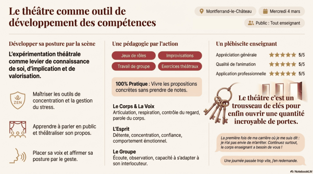 Le théâtre ne se résume pas à l’apprentissage d’un texte ; c’est un laboratoire de la connaissance de soi. Pour un enseignant, maîtriser sa posture, son regard et son souffle est essentiel. Cette formation a été conçue pour aider les participants à s’impliquer physiquement et émotionnellement, facilitant ainsi une meilleure gestion de la classe et une communication plus percutante.