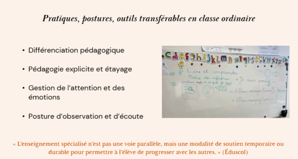 Ainsi, certains ont découvert des méthodes de différenciation utilisées en Segpa, des techniques de suivi individualisé en Ulis, ou des routines de travail collaboratif utilisées dans les classes de 4e « Découverte », pouvant profiter à l’ensemble des enseignants.