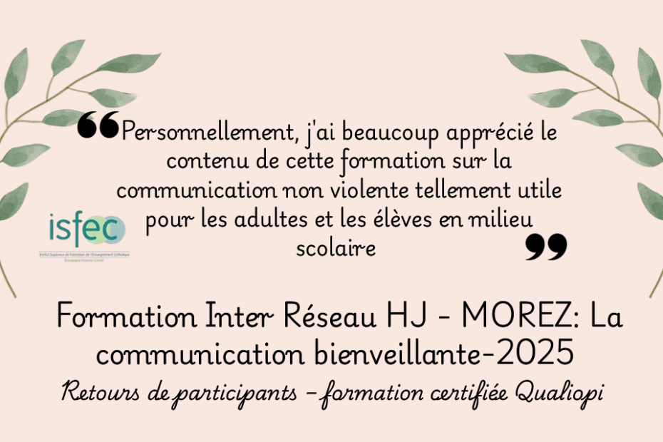 “Personnellement, j’ai beaucoup apprécié le contenu de cette formation sur la communication non violente tellement utile pour les adultes et les élèves en milieu scolaire.”