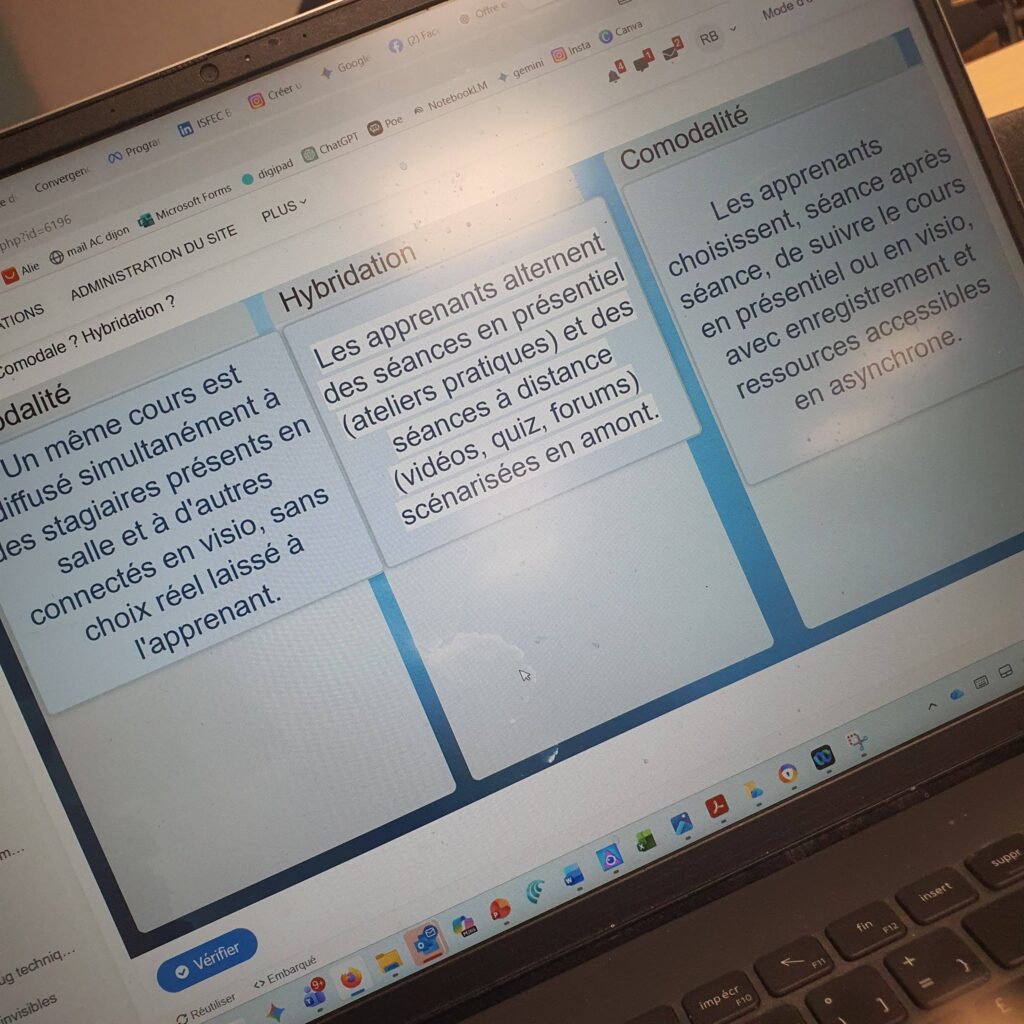 Après une distinction entre les termes comodal, bimodal ou hybride en travaux de groupes. Les échanges sur les situations vécues (parfois marquées par des aléas techniques) ont permis d’affiner les possibilités et d’identifier les limites de ces modalités de formation.