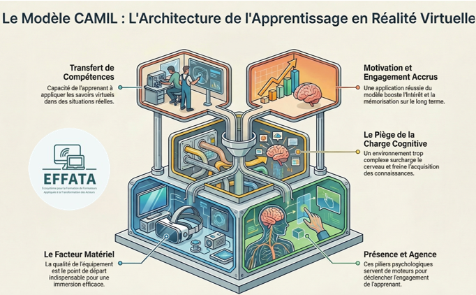 Au-delà de l’outil, c’est l’aspect cognitif qui a été placé au centre des débats par et Benjamin DE WITTE (Université de Lille) . Grâce au modèle CAMiL, les référents ont analysé comment la « présence » (le sentiment d’être dans la scène) et « l’agency » (la capacité d’action) boostent la motivation intrinsèque. Un point de vigilance a toutefois été soulevé : le cyber sickness (mal des transports virtuel), rappelant que la technologie doit toujours être au service du confort et de l’architecture cognitive de l’apprenant.