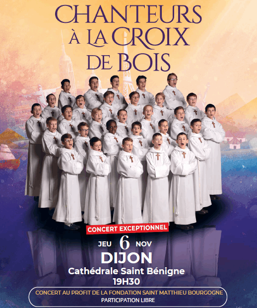 Une soirée musicale et solidaire à Dijon Le jeudi 6 novembre à 19h30, la cathédrale Saint-Bénigne de Dijon accueillera un événement unique : le concert des Petits Chanteurs à la Croix de Bois, chœur emblématique… Un concert exceptionnel pour soutenir l’enseignement catholique en Bourgogne