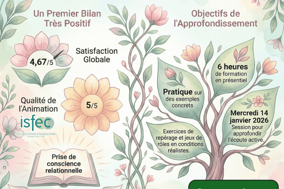 Le mercredi 14 janvier 2026, l’équipe pédagogique et le personnel OGEC de l’école Sainte-Marie de Montbard se sont réunis pour une journée de formation intensive consacrée à l’écoute bienveillante. Ce temps fort fait suite à… Montbard : L’école Sainte-Marie approfondit l’art de la communication bienveillante avec l’ISFEC