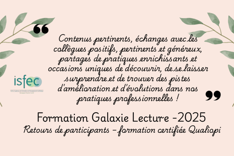 Citation mise en avant « Une formation dynamique, de qualité et pratico-pratique : encore félicitations à toute l’équipe de la Bulle littéraire et de l’ISFEC ! »Formation : Galaxie Lecture, 2025 Contexte Dans un contexte où le… On parle de nous – Galaxie Lecture