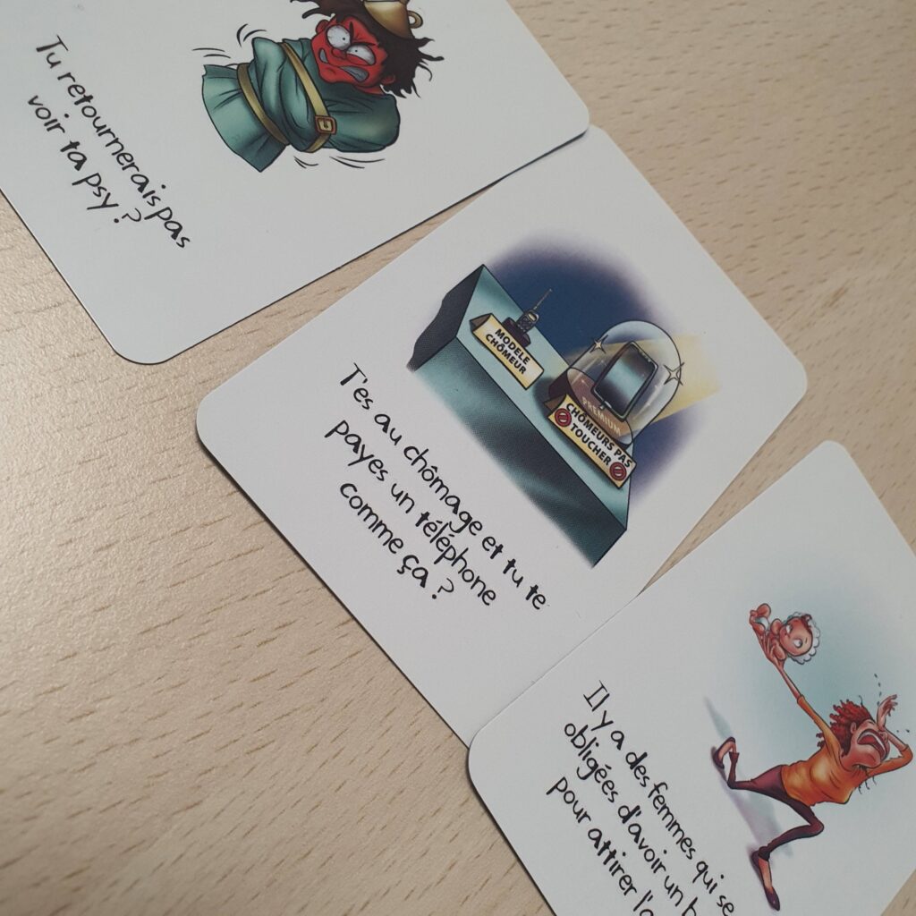 | Résumé | Le déclencheur : Un joueur lit une carte « Attaque » (une remarque méchante, sexiste, raciste, ou un pique personnel). La réponse : Le ou les autres joueurs doivent répondre le plus tac-au-tac possible en utilisant l’un des styles imposés (autodérision, contre-attaque, pirouette, silence, etc.). L’objectif : Développer son agilité verbale et son affirmation de soi. |