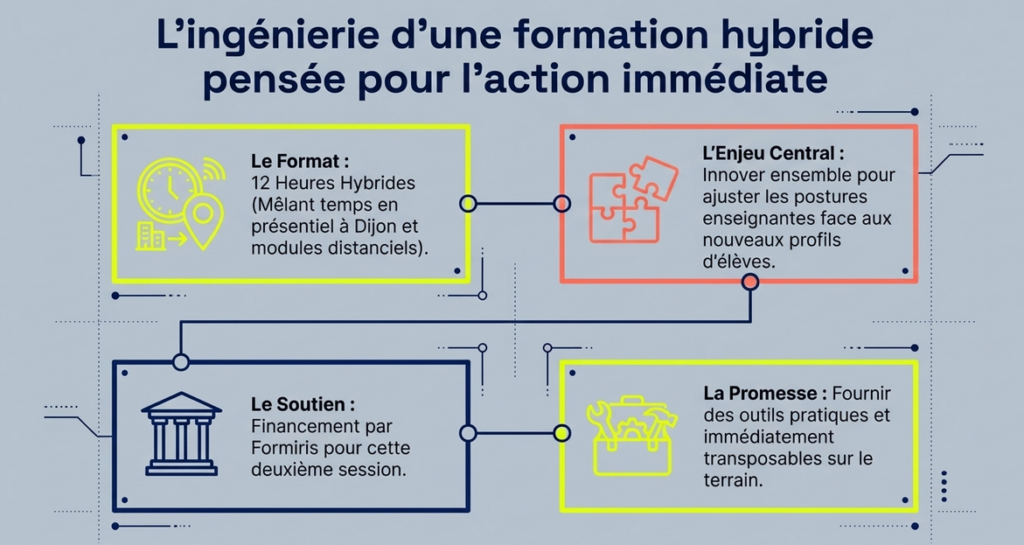 Le travail d’équipe transdisciplinaire est aujourd’hui bien plus qu’une option : c’est une nécessité face à l’évolution des profils d’élèves et des pratiques pédagogiques. Pour sa deuxième session, la formation « Coopérer avec ses collègues pour rendre les élèves plus créacteurs » a réuni des enseignants motivés autour d’un format hybride de 12 heures, mêlant présentiel à Dijon et temps distanciels. L’enjeu ? Innover ensemble pour passer d’une transmission frontale à un accompagnement où chaque élève devient l’acteur — et le créateur — de son propre savoir.